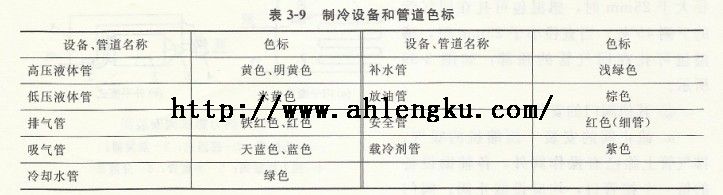油漆防腐的要求制冷设备和管道防腐工程应在系统严密性试验合格后进行。保温管道及暗装管道、镀锌管可不做防腐。对于非保温明装管道,镀锌管外刷调和漆两道,无缝钢管外表面在认真除锈后,外表面刷红丹防锈漆两道,调和漆两道,再根据管道类型在表面涂以色标漆与流向,设备和管道的色标见表3—9所示。非镀锌金属构件去锈后刷红丹漆二道。